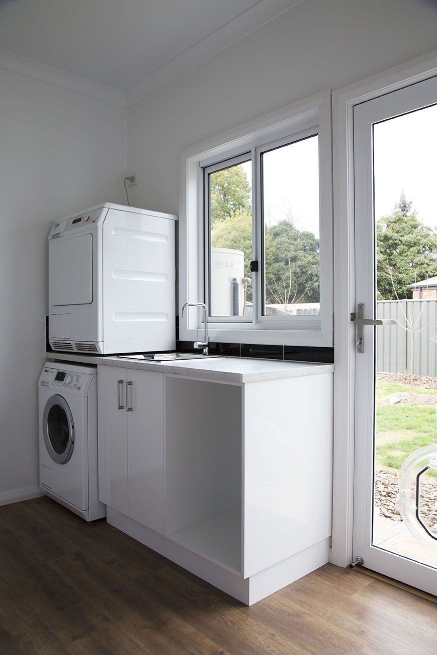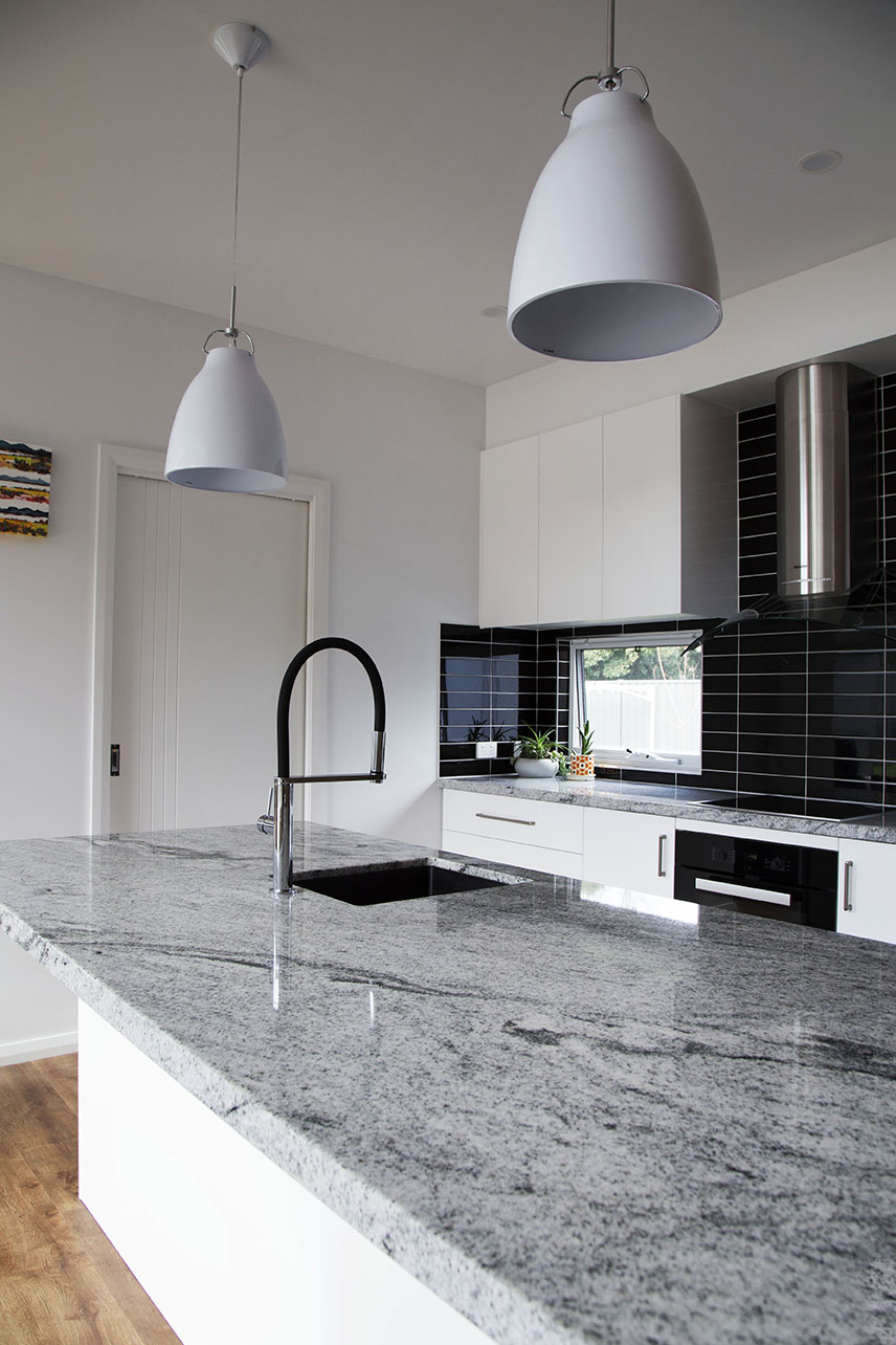The modern kitchen with its marble benchtops, stunning black splashback and concealed pantry brings clean lines to create the centrepiece of the centrally located living area.